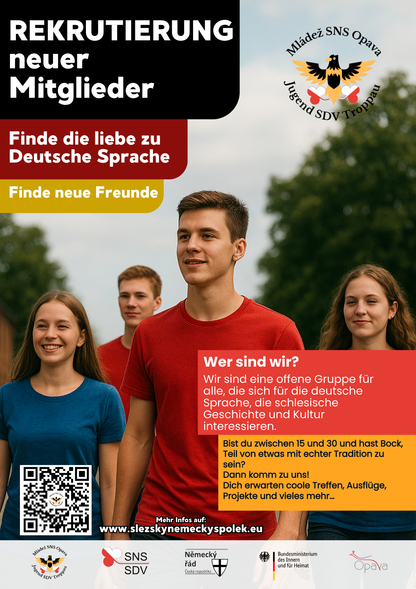 Interessierst du dich für die deutsche Sprache, die Geschichte Schlesiens oder möchtest du einfach neue Leute kennenlernen und mehr erleben als nur Schule und soziale Netzwerke? Die Jugend des SNS Opava öffnet ihre Türen für neue Mitglieder und lädt alle jungen Interessierten herzlich ein.