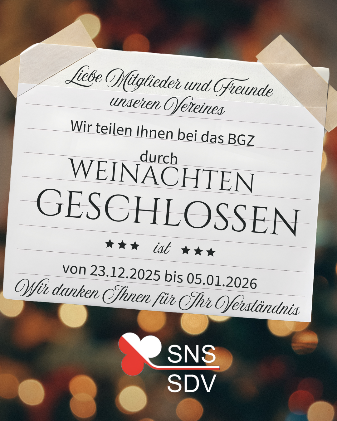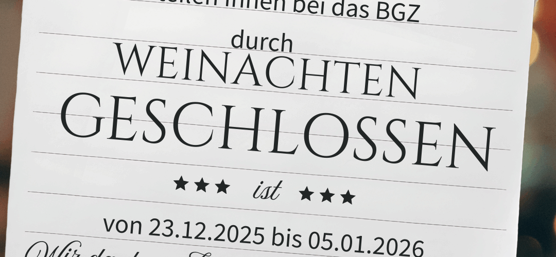 wir möchten Sie darüber informieren, dass das BGZ aufgrund der Weihnachtsfeiertage im Zeitraum vom 23. Dezember 2025 bis einschließlich 5. Januar 2026 geschlossen ist. In dieser Zeit finden weder regelmäßige Aktivitäten noch die übliche Vereinsagenda statt.